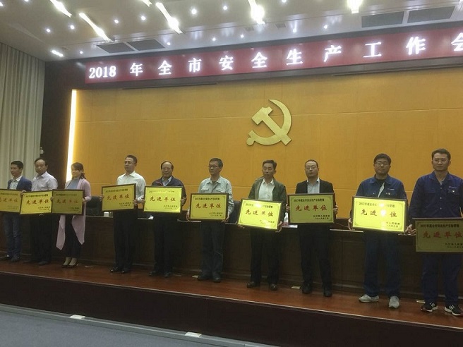 九江市人民政府于2018年4月23日在市政府會議室表彰了“2017年度全市安全生產(chǎn)目標(biāo)管理 先進(jìn)單位”,全市水泥行業(yè)僅江西亞東榮獲該榮譽(yù),并由九江市市政府代市長頒獎(jiǎng),我公司總經(jīng)理領(lǐng)獎(jiǎng)。